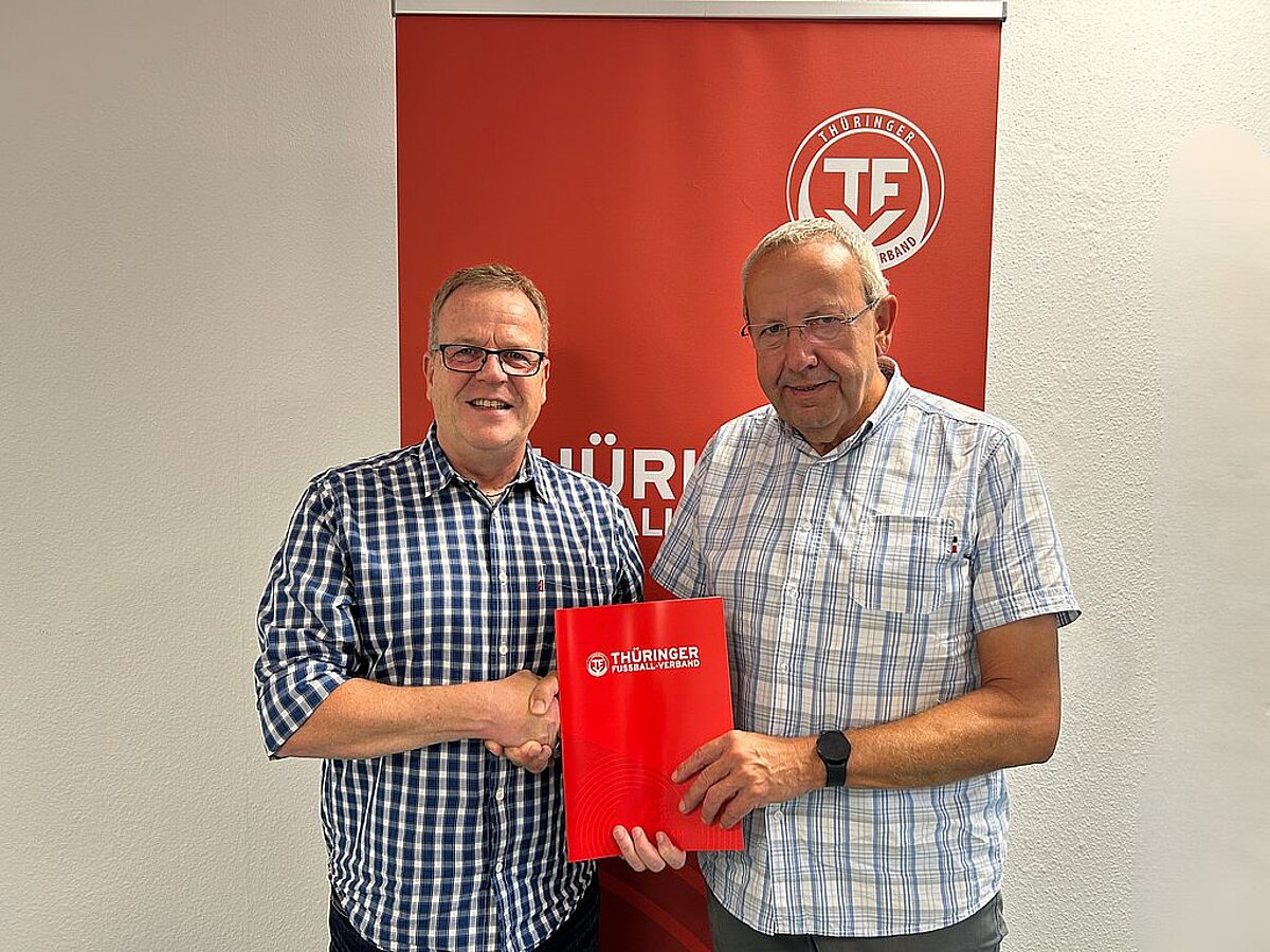 Die AOK PLUS setzt ihr Engagement im Thüringer Fußball fort und verlängert zur neuen Saison den bestehenden Vertrag mit dem Thüringer Fußball-Verband (TFV). Uwe Jahn, Spezialist Sportverbände der AOK PLUS und Udo Penßler-Beyer, Präsident des TFV, bestätigten die Partnerschaft offiziell. Damit bleibt die AOK PLUS nicht nur Gesundheitspartner des Verbandes, sondern auch weiterhin Namensgeber und Unterstützer des AOK PLUS Landespokals der Junioren.