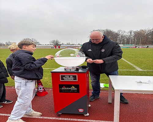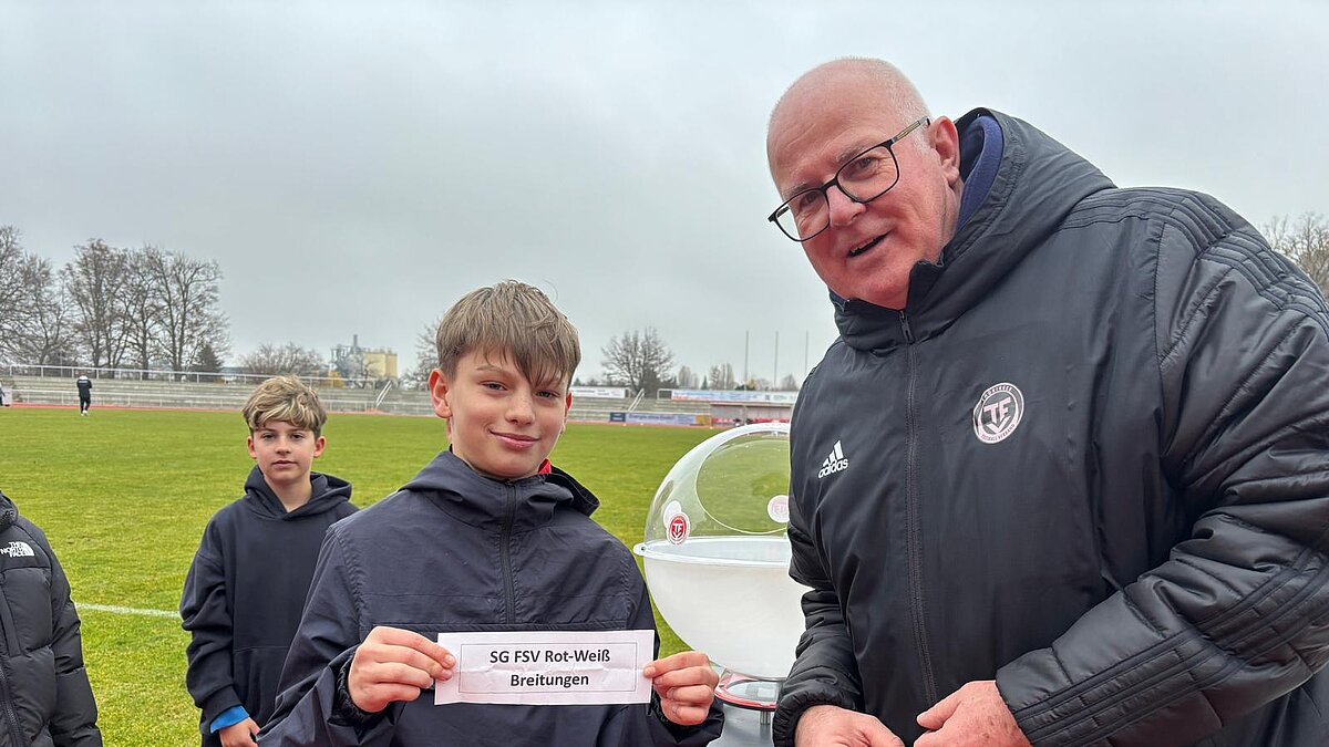 An der Seite von Jörg Drößler, Mitglied im Jugendausschuss des Thüringer Fußball-Verbandes und Staffelleiter für Ligabetrieb und Pokal der C-Junioren, unterstützte Elias Abendroth – ein Nachwuchskicker in der D-Junioren des FSV Wacker – tatkräftig beim Ziehen der Lose.