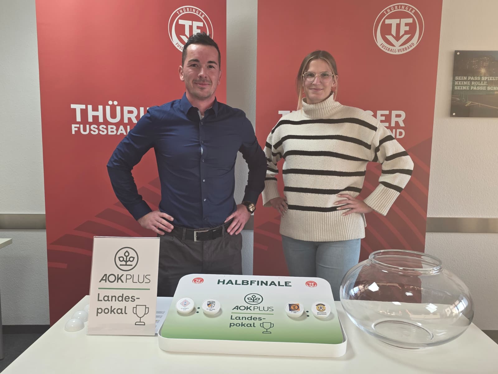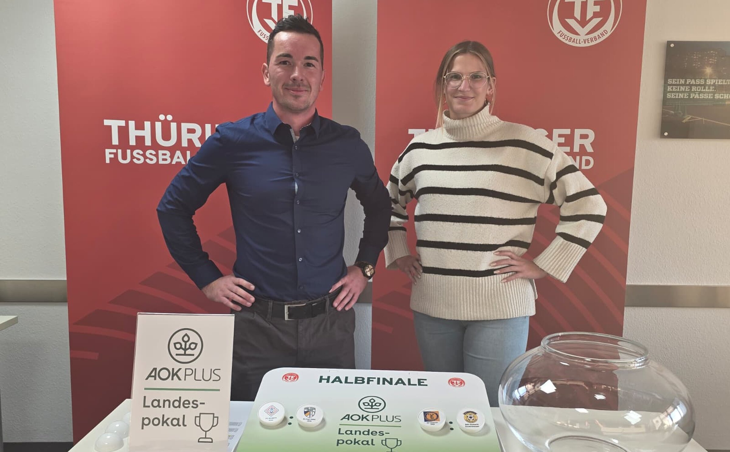Am 07. Januar wurden in der Geschäftsstelle des Thüringer Fußball-Verbandes die Halbfinalpaarungen des AOK PLUS Pokals der A- bis D-Junioren ausgelost. Erik Zimmermann, Mitglied des TFV-Jugendausschusses und Ansprechpartner für den Nachwuchs-Landesspielbetrieb, leitete die Auslosung, bei der Celine Kirchner, Mitarbeiterin in der Qualifizierung des TFV, die Kugeln zog.