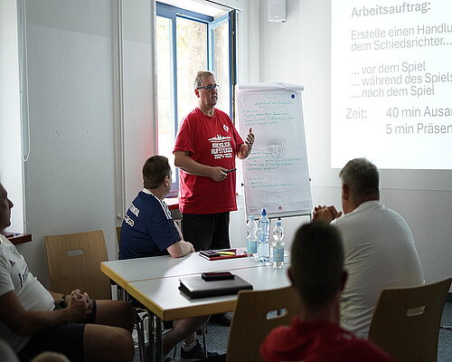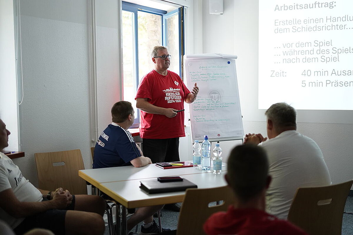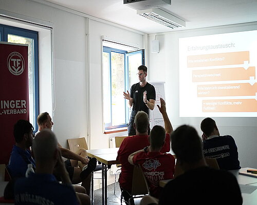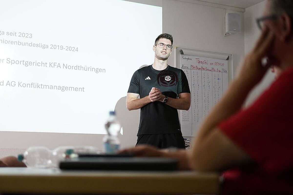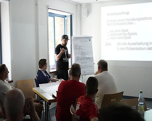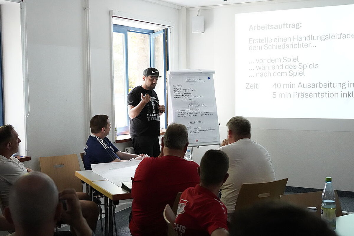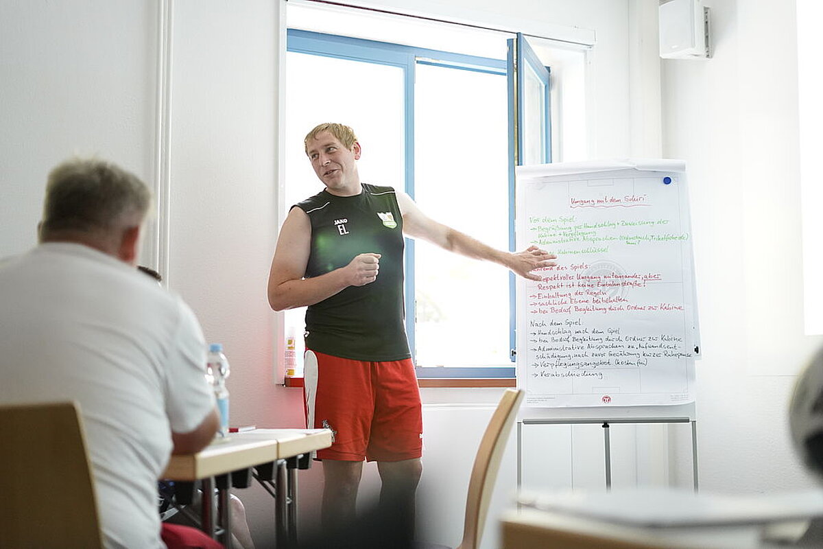 Am dritten Lehrgangstag erhielten die teilnehmenden Trainer eine praxisnahe Einführung in das Thema „Konfliktmanagement – Umgang mit dem Schiedsrichter“ durch den Schiedsrichter Paul Baudis. Ziel der Einheit war es, das gegenseitige Verständnis zwischen Trainern und Schiedsrichtern zu fördern und Wege für einen respektvollen Umgang im Spielbetrieb aufzuzeigen. Paul Baudis berichtete anschaulich aus seinem Alltag als Schiedsrichter und zeigte typische Konfliktsituationen auf, die zwischen Trainerbank und Schiedsrichtergespann entstehen können. In Kleingruppen wurden konkrete Handlungsempfehlungen erarbeitet – mit besonderem Blick auf das Verhalten vor dem Spiel, während des Spiels und nach dem Spiel. Die Teilnehmer betonten einstimmig, wie wichtig eine respektvolle Kommunikation, gegenseitige Wertschätzung und ein sachlicher Umgang mit Emotionen für den Ablauf eines Spiels sind. Die Verankerung dieses Themas in der Lizenzverlängerung setzt ein Zeichen für ein faires und sportliches Miteinander auf und neben dem Platz.