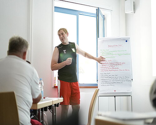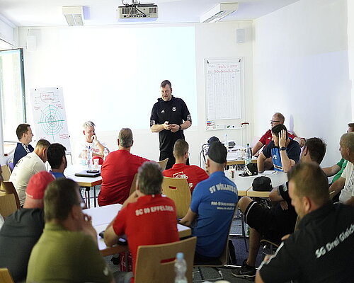 Ein zentraler Bestandteil der Fortbildung war die Auseinandersetzung mit der Trainingsphilosophie Deutschland. In theoretischen und praxisorientierten Mustertrainingseinheiten, die sich speziell auf die Zonen- und Linienverteidigung konzentrierten, wurden aktuelle Ansätze der Trainingsgestaltung vermittelt und deren Umsetzung im Vereinsalltag diskutiert. Ergänzt wurden diese Inhalte durch den Themenkomplex Konfliktlösung. Dabei ging es um den professionellen Umgang mit typischen Konfliktsituationen im Traineralltag. Anhand praxisnaher Fallbeispiele und Fachimpulsen wurden Handlungsmöglichkeiten aufgezeigt und reflektiert.