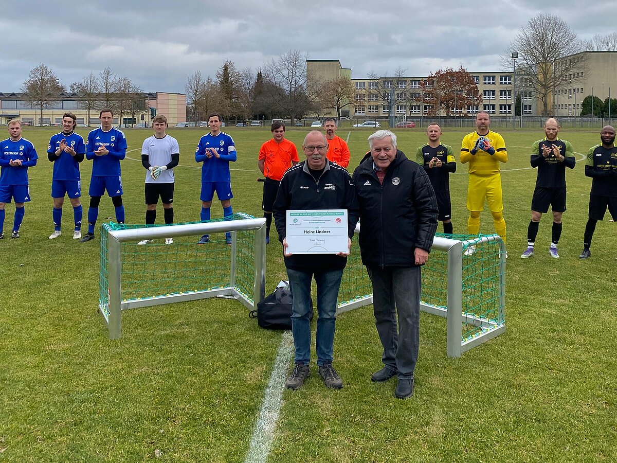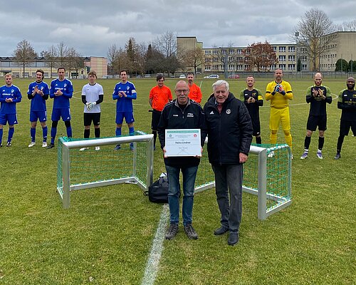 Im Rahmen der Kreisoberliga-Partie zwischen dem SV Westring Gotha und der SG SV Borsch 1925 II durfte Heinz Lindner seine verdiente Club100-Vereinsehrung entgegennehmen. Peter Brenn, Ehrenmitglied des Verbandes, übernahm gerne die Ehrung und kam nicht mit leeren Händen. Als Anerkennung erhielt der Verein zwei Mini-Tore, ein Ballpaket von adidas sowie Heinz Lindner seine persönliche Ehrentafel vom Club100 des DFB.