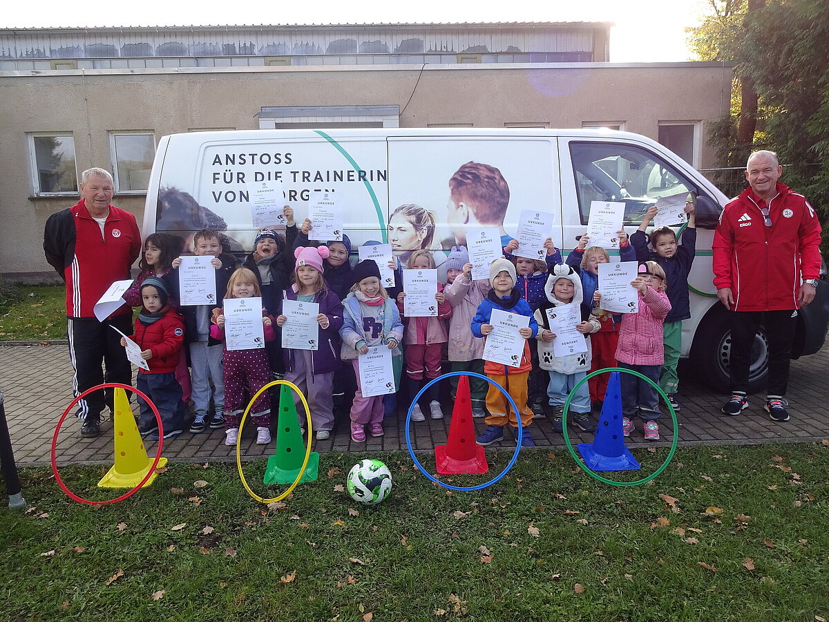 Auch in diesem Herbst ist das DFB-Mobil wieder bei zahlreichen Vereinen, Schulen und Kindertagesstätten auf Tour. Zuletzt besuchten die DFB-Mobil Teamer Dirk Schmidt und Bernd Bock die Kindertagesstätte „Bunte Welt“ in Kahla, wo 20 Mädchen und Jungen das DFB-Paule-Schnupper-Abzeichen ablegen konnten.