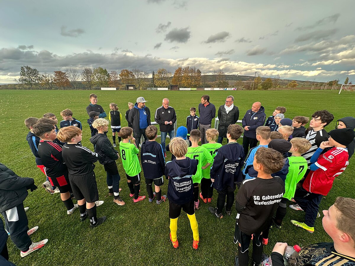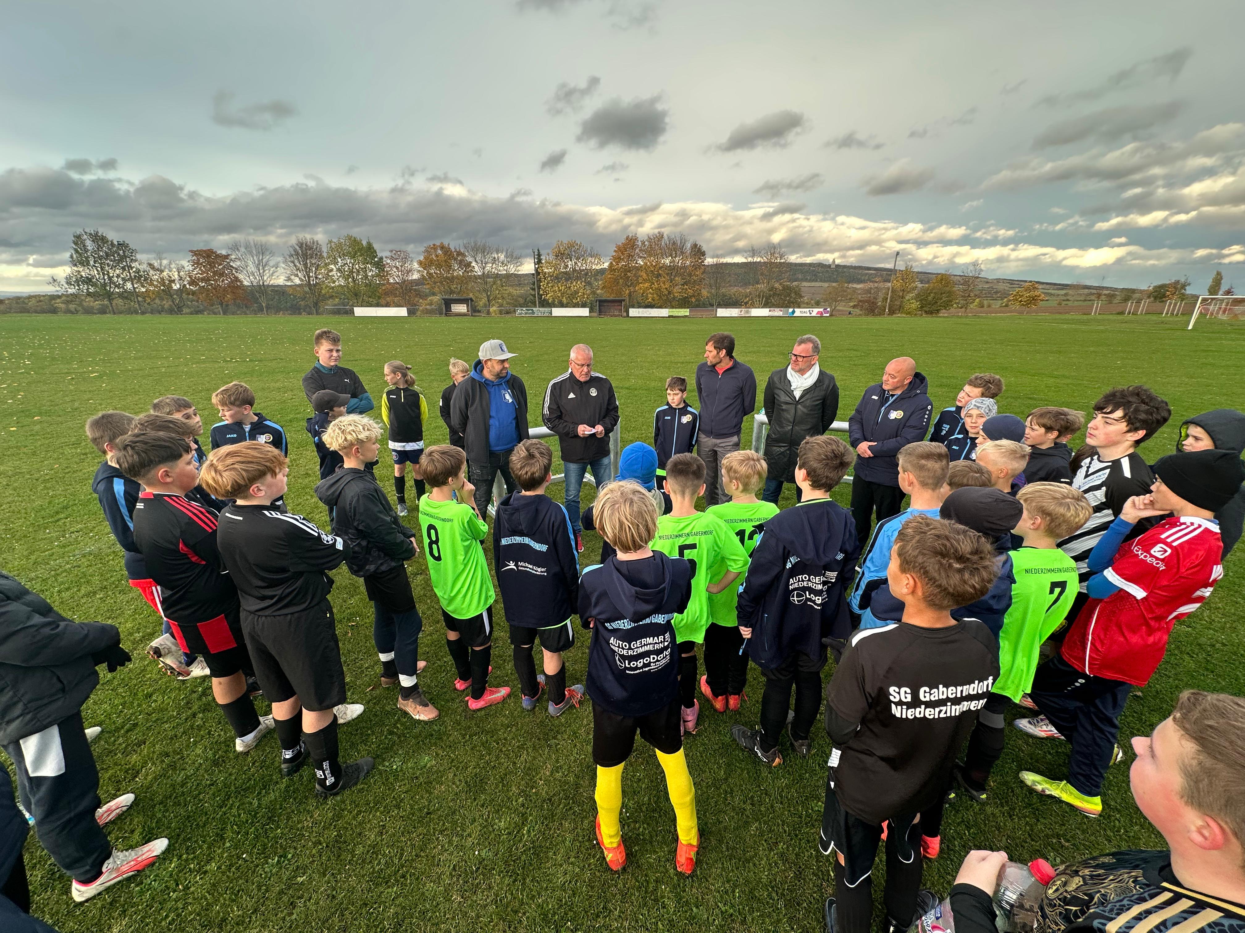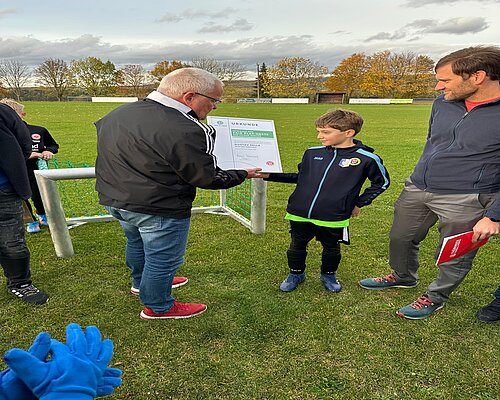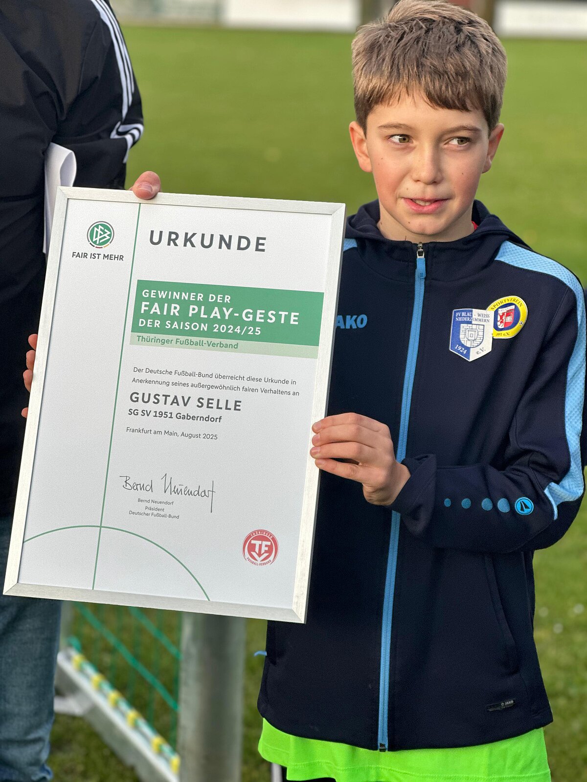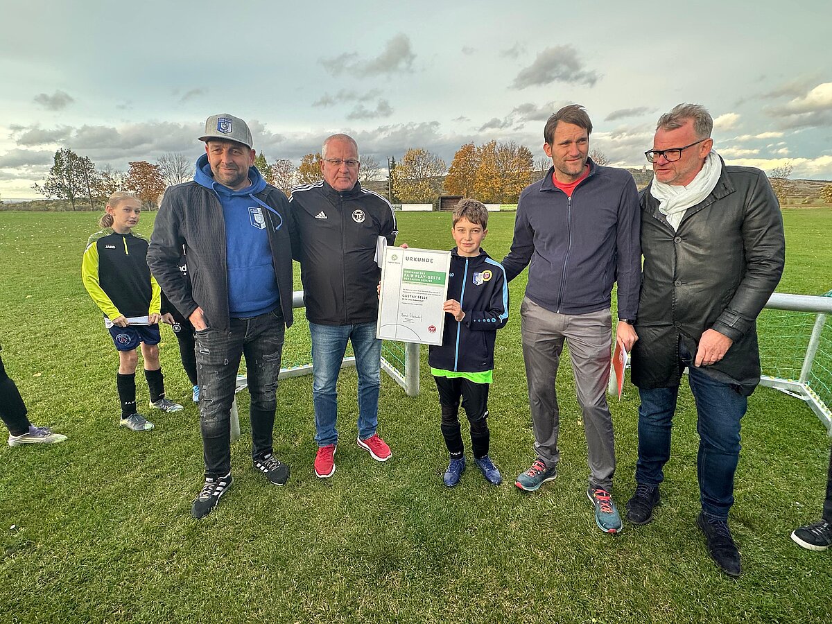 Im Rahmen eines Freundschaftsspiels der D-Junioren der SG Niederzimmern/Gaberndorf und dem FSV Sömmerda durfte ein junger Kicker seine verdiente Auszeichnung entgegennehmen. Gustav Selle (SV 1951 Gaberndorf) wurde nämlich im Thüringenweiten Voting zum Jahressieger der Aktion TEAG Fair ist mehr gewählt. Uwe Coccejus (Leiter der AG Sicherheit & Fairplay beim TFV) freute sich, die Ehrung, zu der Mannschaftskameraden, Eltern und Vereinsvertreter einen würdigen Rahmen bildeten, vorzunehmen.