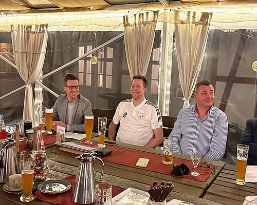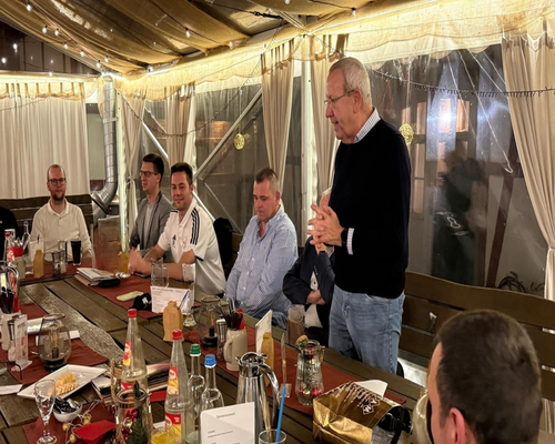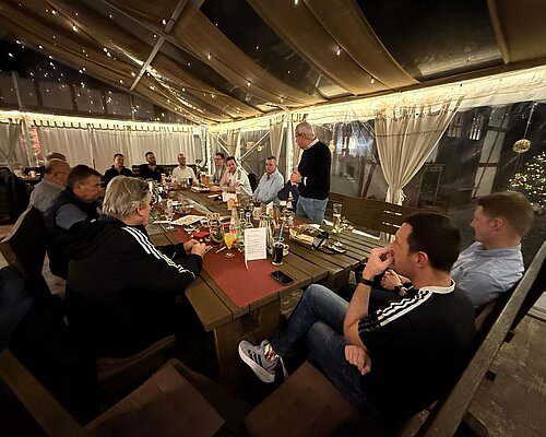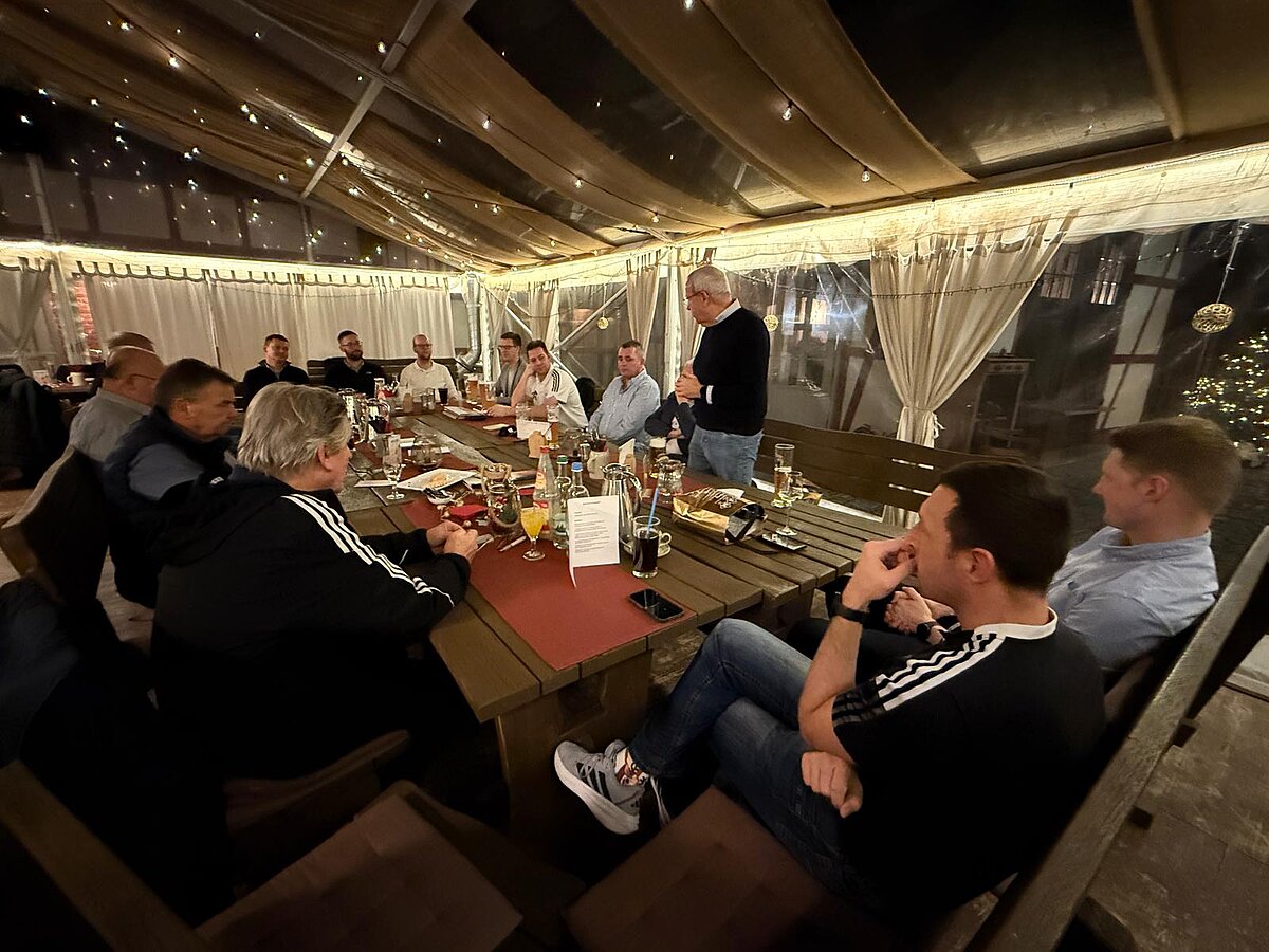 Nach der arbeitsintensiven Sitzung fand am Abend eine kleine Jahresabschlussfeier des Ausschusses mit dem Lehrstab statt. Inzwischen war auch der Präsident des Thüringer Fußball-Verbandes, gleichzeitig Vorsitzender des Schiedsrichterausschusses des NOFV und des DFB, Udo Penßler-Beyer, eingetroffen. Er bedankte sich bei den Anwesenden – darunter auch Jürgen Muscat und Peter Weise, zwei kürzlich ausgeschiedene Mitglieder des Ausschusses – für die geleistete ehrenamtliche Arbeit. Diesen Worten schloss sich Verbandsschiedsrichterobmann Burkhard Pleßke an. Er würdigte die engagierte Arbeit des Ausschusses und des Lehrstabes, die maßgeblich zum aktuellen hohen Leistungsstand der Thüringer Spitzenschiedsrichter im Verband, Regionalverband und DFB beigetragen hat.