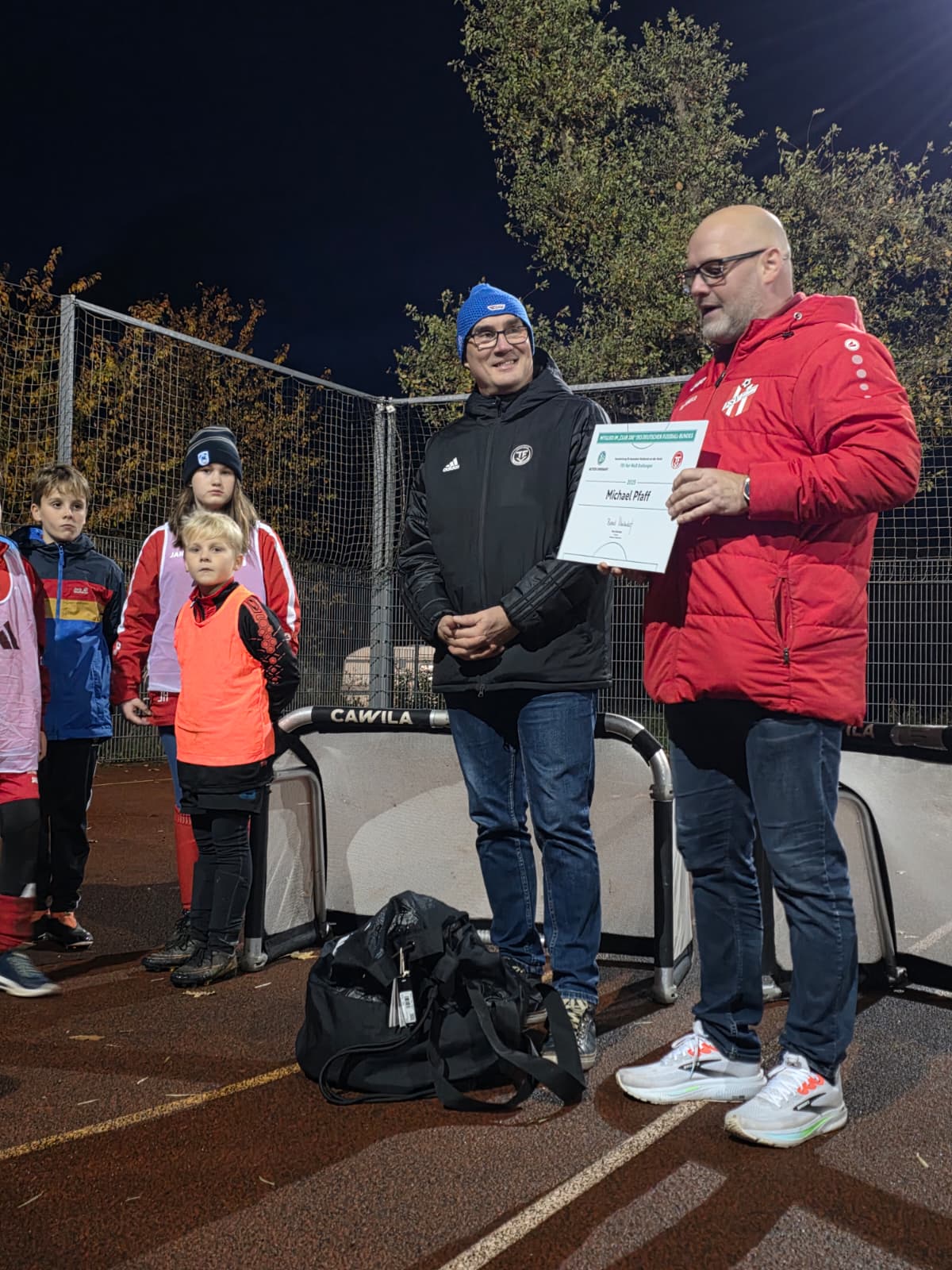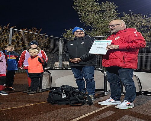 Einer von ihnen ist Michael Pfaff, der Vereinsvorsitzende des FSV Rot-Weiß Breitungen. Mit großem Einsatz und bereits über viele Jahre arbeitet er daran, seinen Verein zu führen und zu entwickeln. Aufgrund seines Engagements wurde Michael Pfaff mit dem Ehrenamtspreis dekoriert und in den renommierten „Club 100“ aufgenommen. Eine ganz besondere Auszeichnung. So war es auch dem Vizepräsidenten des Thüringer Fußball-Verbandes, Mike Noack, eine große Freude Michael Pfaff nochmal persönlich in Breitungen – an Michaels Sportstätte, der Friedenskampfbahn – zu gratulieren. Im Gepäck waren neben der Urkunde des DFB ein Ballset und Minitore, die künftig im Verein genutzt werden.