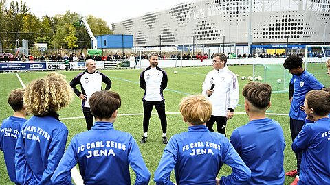 Im Mittelpunkt der Veranstaltung stand eine moderierte Praxiseinheit mit Nachwuchsmannschaften des FC Carl Zeiss Jena. Die Referenten demonstrierten dabei die “Kleinen Spielformen der Trainingphilosophie Deutschland”, welche sich als besonders geeignet für alle Alters- und Leistungsklassen erwiesen haben.