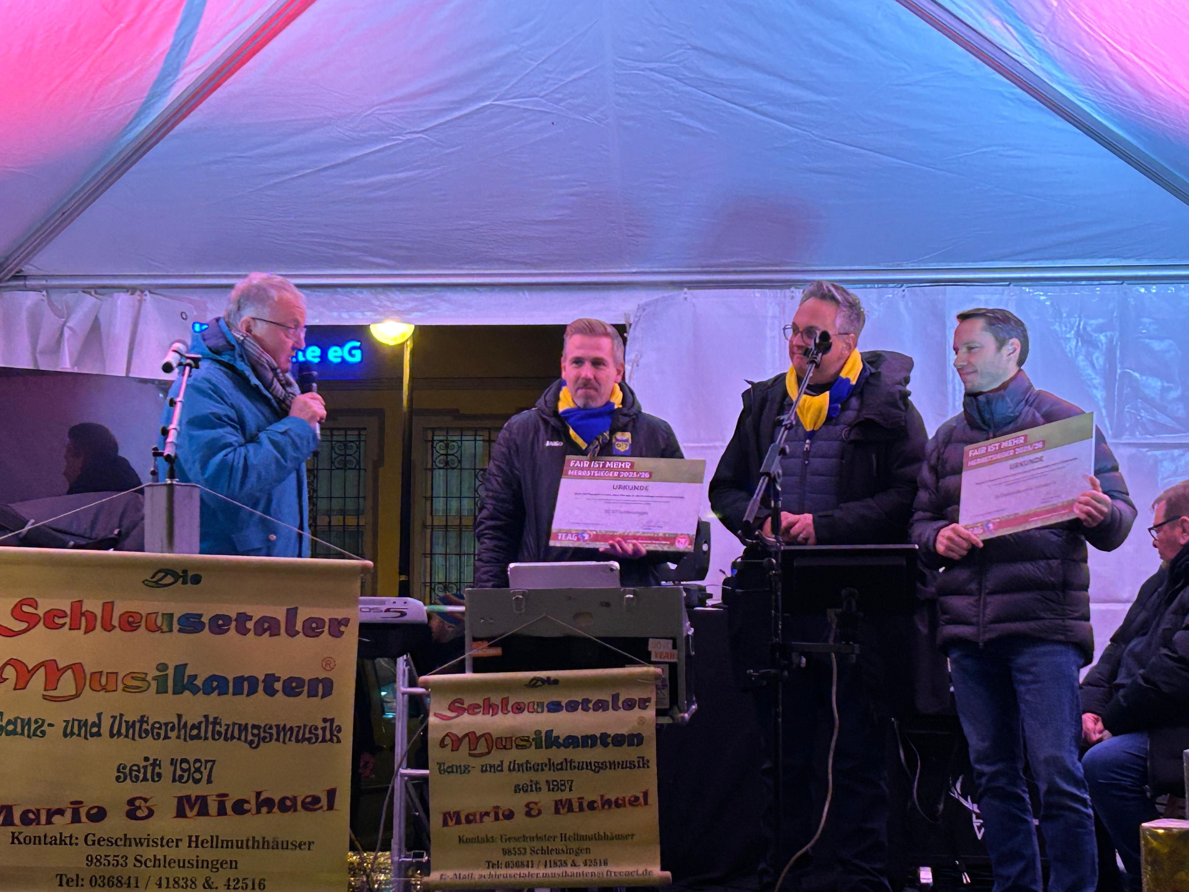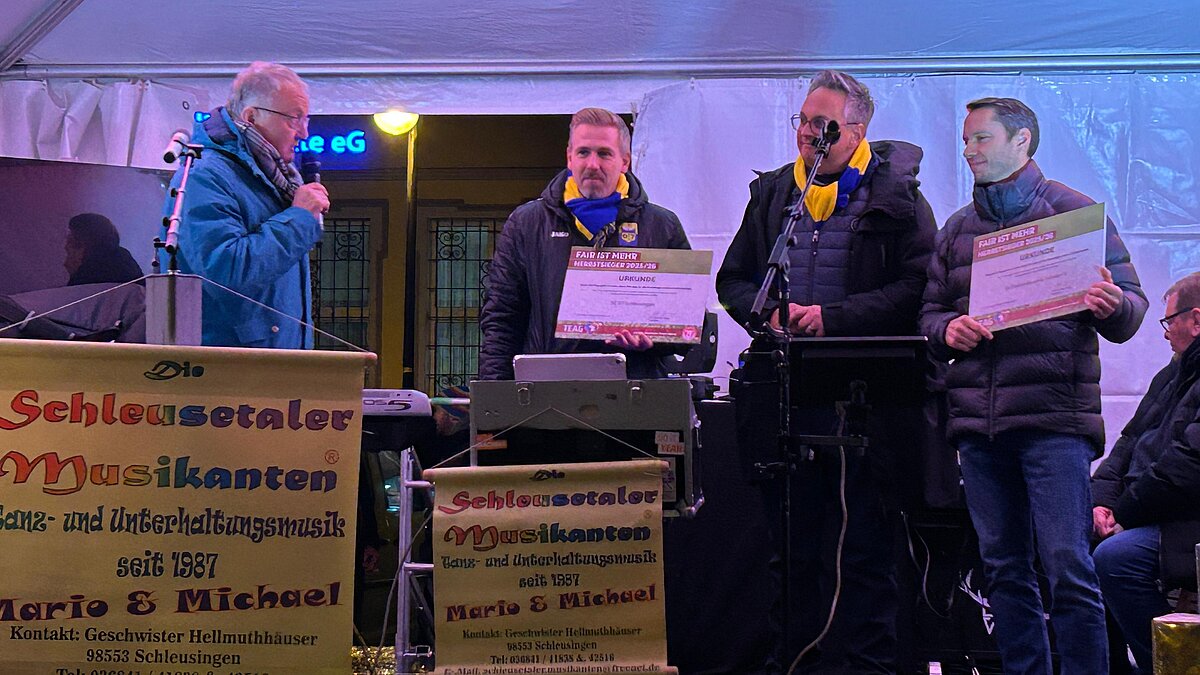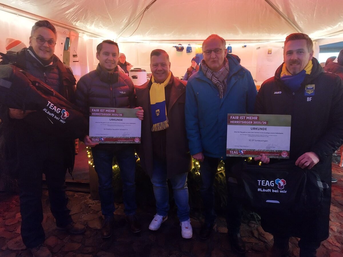 Am vergangenen Samstag übergab TFV-Vizepräsident Ulrich Hofmann auf dem Weihnachtsmarkt in Schleusingen die Urkunden und Preise an die Herbstsieger des TEAG „Fair ist Mehr“-Votings, den SC 07 Schleusingen und den SV Elektro-Keramik Veilsdorf II. Sie hatten sich bei der Online-Abstimmung gegen drei weitere Kandidaten durchgesetzt.