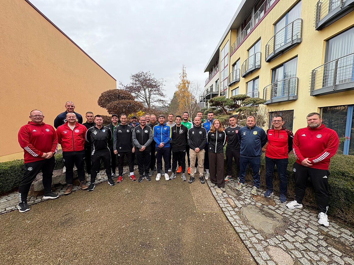 Vom 10. bis 14. November 2025 fand an der Landessportschule Bad Blankenburg die Präsenzphase der C-Lizenz-Ausbildung des TFV-Lehrgangs statt. Unter der Leitung von Silvio Beer und Sven Kreidemeier erlebten die Teilnehmer ein intensives Programm, das Theorie und Praxis miteinander verband. Das wurde bereits am ersten Lehrgangstag deutlich. Neben Impulsvorträgen zu Themen wie Trainingsperiodisierung, Konfliktmanagement und Leistungsfaktoren standen praxisnahe Einheiten auf dem Rasen im Mittelpunkt. Mustertrainingseinheiten nach der Trainingsphilosophie Deutschland sowie altersgerechte Schwerpunkte in Technik, Individual- und Gruppentaktik standen auf der Tagesordnung.