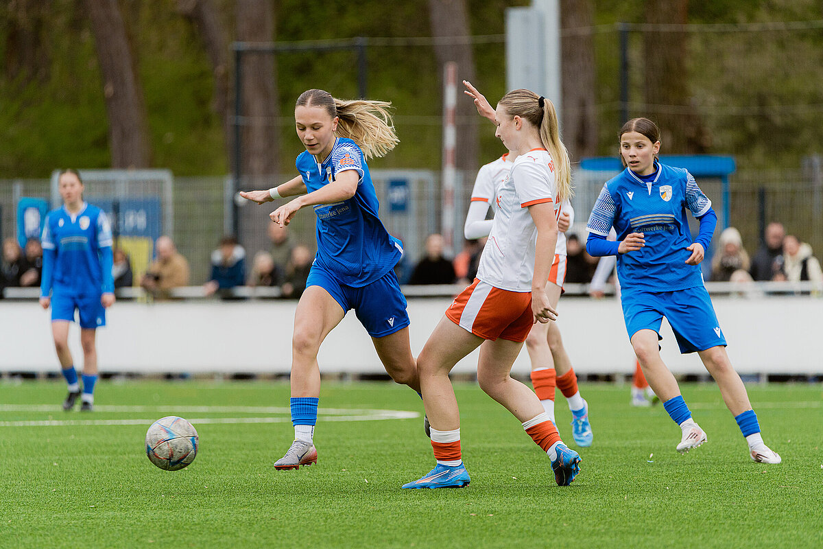 In der Runde der letzten vier trafen die Thüringerinnen, die allesamt Auswahlspielerinnen des Thüringer Fußball‑Verbandes sind, auf die U17 von RB Leipzig. Für Trainer Roy Bergner im Vorfeld ein 50:50‑Spiel, verrät er. Man wusste um die Stärken des Gegners, aber eben auch um die eigenen. Bis sein Team die eigenen Qualitäten auf den Platz brachte, galt es zunächst eine Phase zu überstehen, in der die Leipzigerinnen die FCC‑U17 gehörig unter Druck setzten. „Speziell in der Anfangsphase hat uns RB richtig geärgert, aber wir haben uns gefangen und waren dann die bessere Mannschaft“, so Bergner. Weitere Sicherheit gab, dass die Doppeltorschützin des Tages, Anna Axer, noch vor der Pause die Führung für die Gastgeberinnen erzielte.